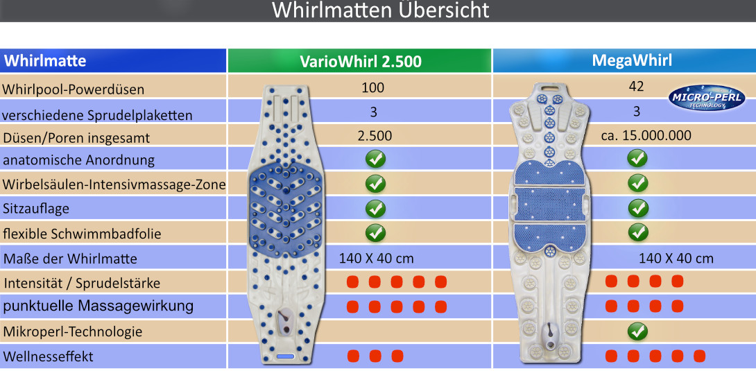 Hier finden Sie eine Auswahl unserer hochwertigen und vielseitigen Whirlmatten. Sämtliche Matten sind aus flexibler, hautfreundlicher Schwimmbadfolie hergestellt und passen sich optimal der Badewannenform an. Alle Whirlmatten wurden vom Arzt Dr. med. Frenkel konzipiert und bieten eine Fülle an Anwendungsmöglichkeiten.